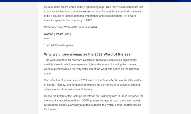 Американский онлайн-словарь Dictionary.com назвал слово «женщина» (woman) словом года.