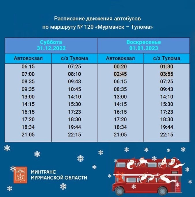 Также ведомство поделилось новогодним расписанием движения автобусов по маршруту №120 «Мурманск – Тулома».