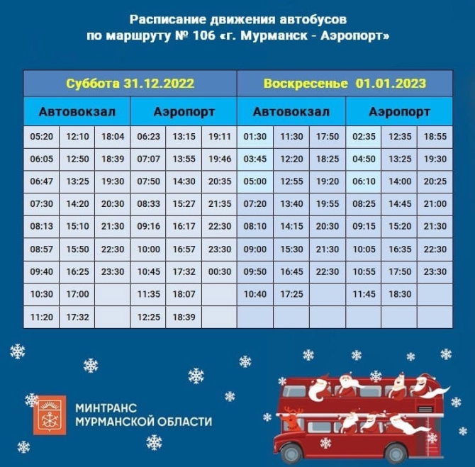 Стало известно новогоднее расписание движения автобусов по маршруту №106 «Мурманск – Аэропорт». Его опубликовало Министерство транспорта Мурманской области.