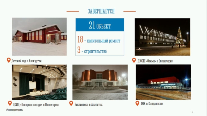 Он отметил, что в Заозёрске и Кандалакше завершается строительство физкультурно-оздоровительных комплексов, а также детсада в Алакуртти.