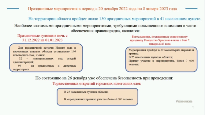 Всего с 20 декабря по 8 января на территории региона пройдет порядка 150 новогодних мероприятий. Ожидается, что в них примут участие около 40 тысяч человек.