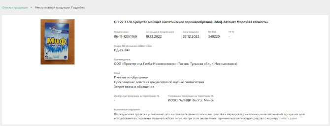 Согласно проведенной проверке, изготовитель стирального порошка «Миф» при маркировке умышленно указал назначение продукции «для использования в стиральных машинах любого типа».