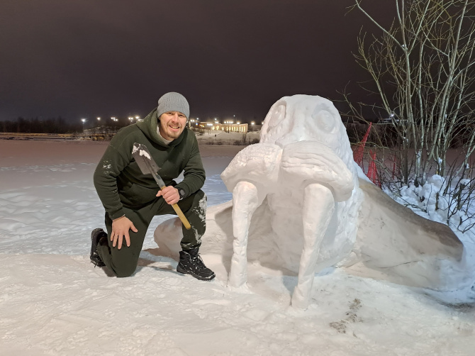 У домика «моржей» в Мурманске появилась снежная фигура моржа. Ее слепил мурманчанин Артём Собинин.