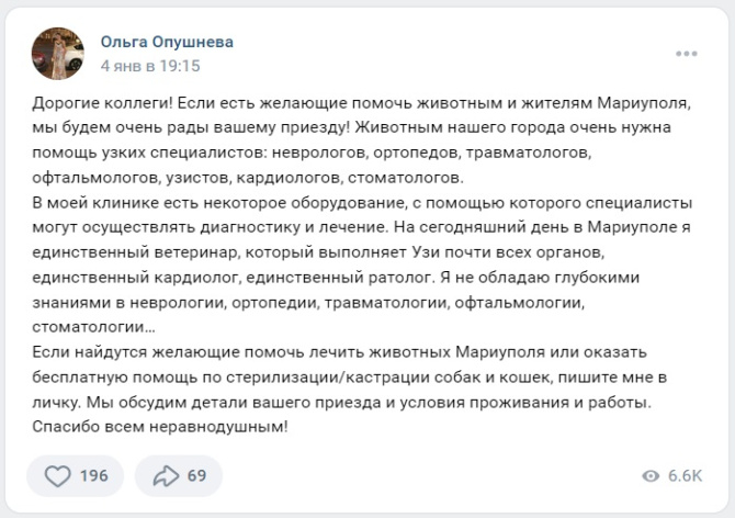 Мурманские ветеринарные врачи ветеринарной клиники «Фаворит» поедут в Мариуполь, чтобы помочь единственному в городе ветеринарному врачу - Ольге Опушневой. Поездка запланирована на 20 февраля.