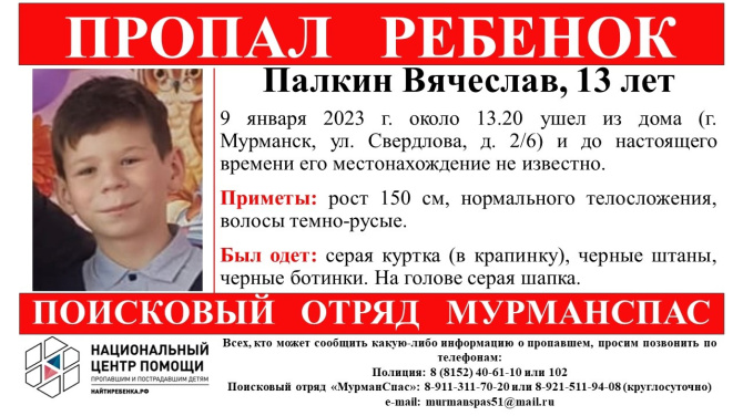 13-летний Вячеслав Палкин пропал в Мурманске 9 января. Мальчик ушел из дома на улице Свердлова, 2/6 около 13:20. До настоящего времени его местонахождение неизвестно.