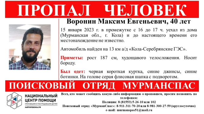 40-летний Максим Воронин уехал из дома в Коле в промежутке между 16 и 17 часов 15 января. Его автомобиль обнаружили на 13 км автодороги «Кола-Серебрянские ГЭС».