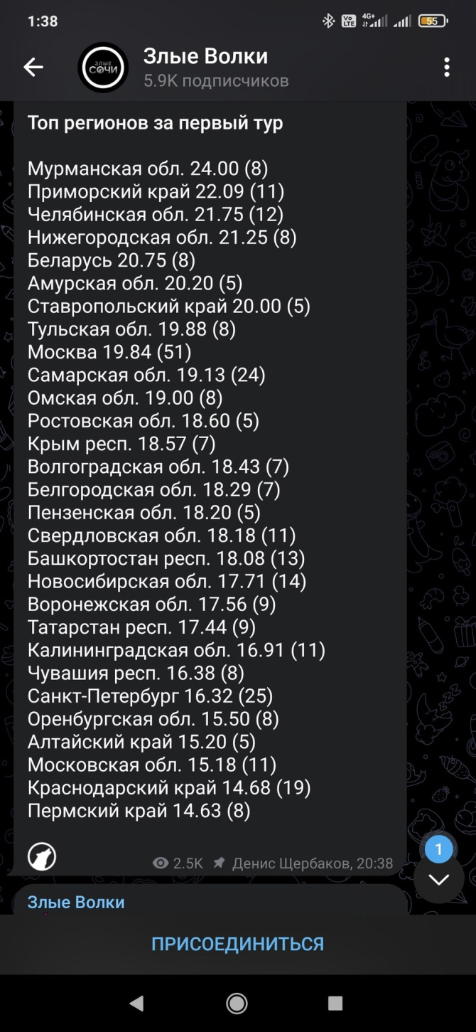 «Ниже скрин одного неофициального, но уважаемого телеграм-канала о КВН который ведет различную КВН - статистику, в том числе и по регионам! По итогам первого тура - Мурманская область на первом месте!», - говорится в сообщении Мурманской лиги КВН.