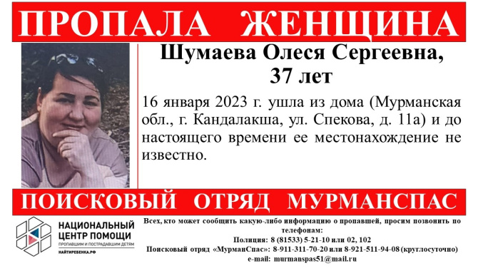 В Кандалакше пропала 37-летняя Олеся Шумаева.