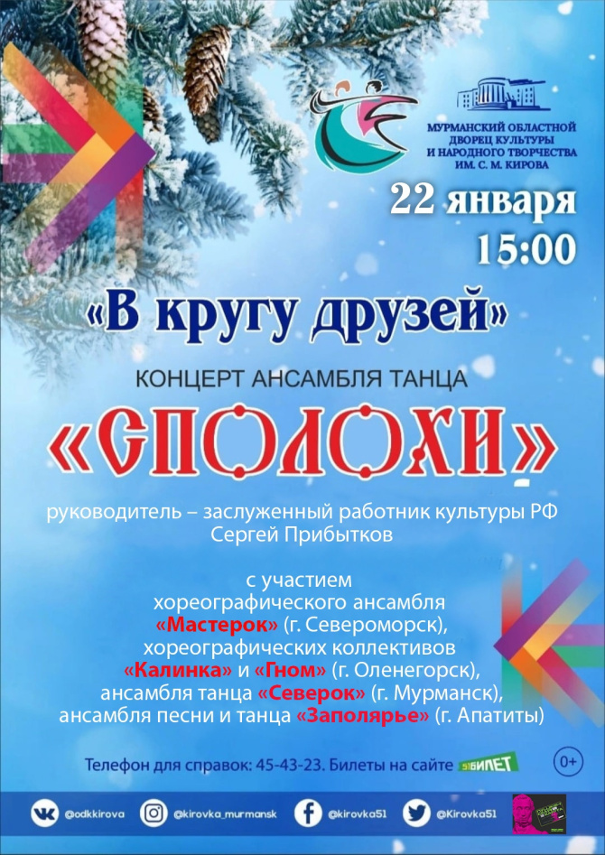 В мурманском областном Дворце культуры и народного творчества имени С. М. Кирова 22 января состоится концерт «В кругу друзей» ансамбля танца «Сполохи».