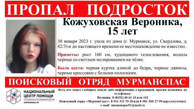 В Мурманске пропала 15-летняя Вероника Кожуховская. 30 января подросток вышла из дома №42/3 на улице Свердлова, и до их пор ее местоположение неизвестно.