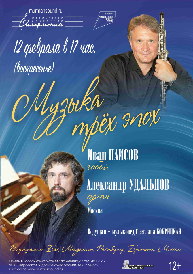 12 февраля Мурманская филармония приглашает на органный концерт «Музыка трех эпох» в исполнении московских музыкантов - гобоиста Ивана ПАИСОВА и органиста Александра УДАЛЬЦОВА.