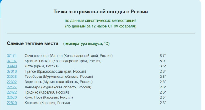 9 февраля Мурманская область заняла большую половину ТОПа экстремальных точек погоды в России.