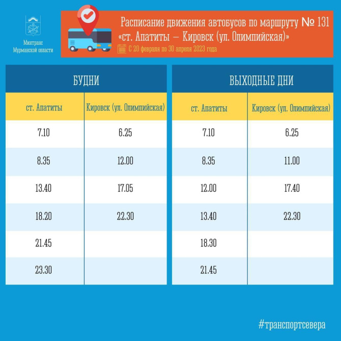 С 20 февраля по 30 апреля 2023 будет изменено расписание автобусов маршрута № 131 «ст. Апатиты - Кировск (ул. Олимпийская)».
