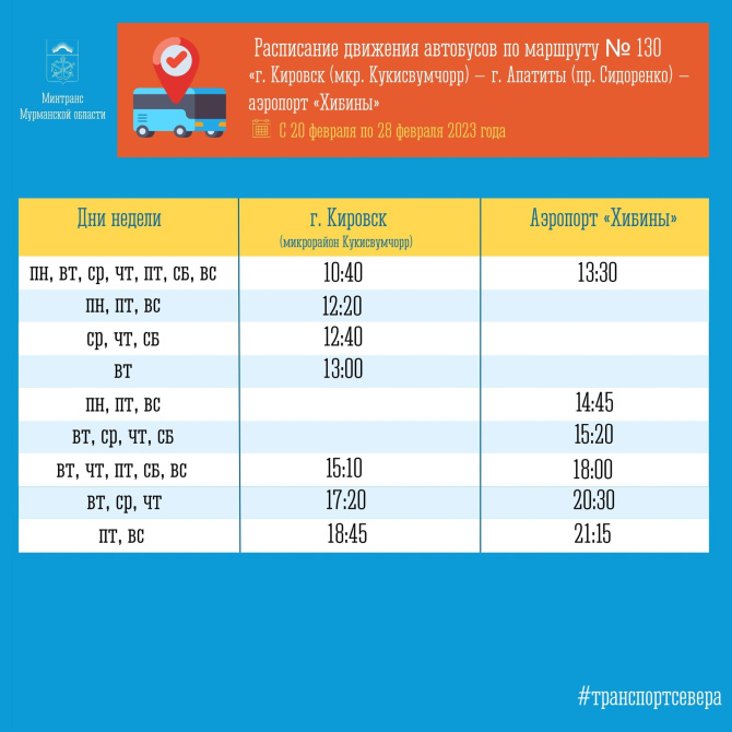 Также с 20 февраля по 28 февраля 2023 изменится расписание движения автобусов маршрута № 130 «г. Кировск (микрорайон Кукисвумчорр) – г. Апатиты (пр. Сидоренко) – аэропорт «Хибины».