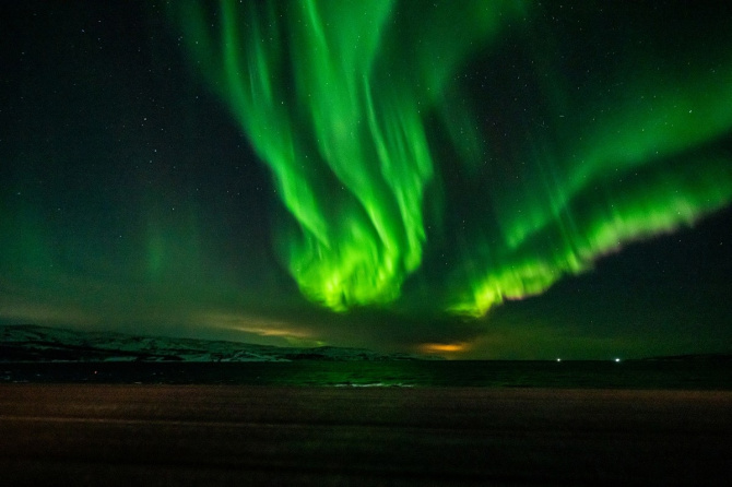 Всё вроде бы на месте: и ночь черна, и облака рассеялись, и вот оно - сияние! Но фоткать его в условиях ветра 20 метров/секунду не было никакой возможности! Всё, что вы здесь видите, - это оно случайно получилось, когда порывы ветра совпадали с движением амплитуды моего тела, которое пыталось хоть как-то быть в вертикально-неподвижном состоянии (что там было абсолютно невозможно).