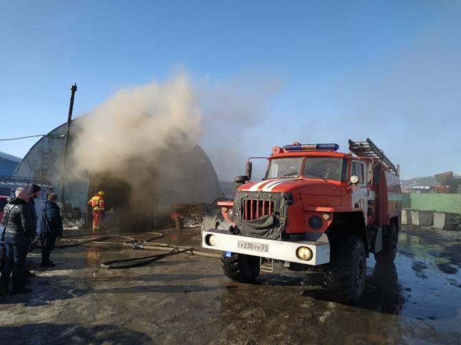24 спасателя и 7 единиц техники были задействованы для тушения пожара, который произошел около 14:00 7 апреля в ангаре на Героев-североморцев, 100а, в Мурманске.