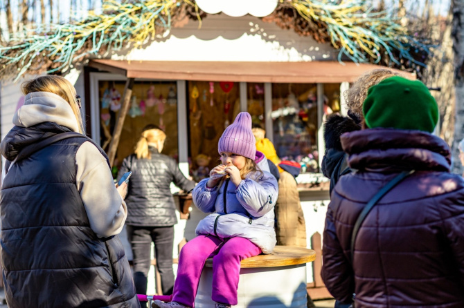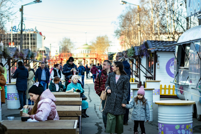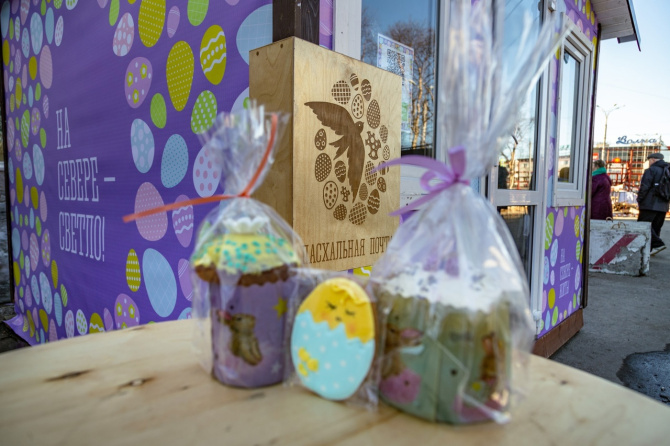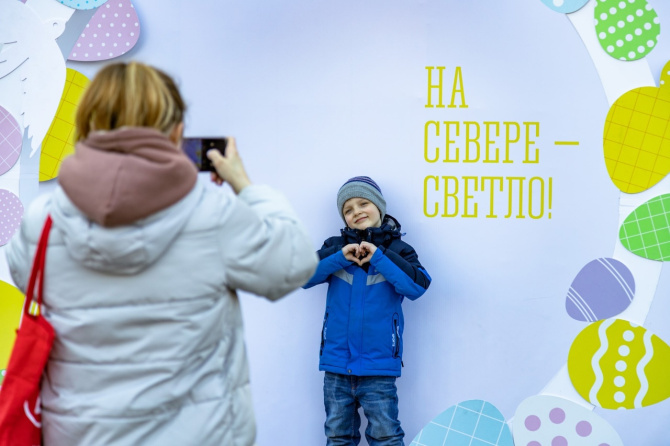 Кроме еды и подарков, с 16:00 до 20:00 северяне смогут бесплатно отправить по территории России пасхальные открытки. Есть шатер с мастер-классами для детей, две красиво украшенные качели и четыре фотозоны. Одна из них особенно пользуется популярностью у детей.