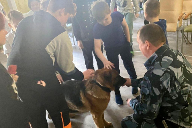 В Доме культуры Ленинского округа прошло мероприятие для школьников средней школы №38, посвященное работе служебных собак во время Великой Отечественной Войны. Занятие провели инструктор группы по боевой и служебной подготовке отдела по конвоированию УФСИН Яна Киричева, а также кинологи мурманской ИК-17 Владимир Кулаков и Александр Бурлин.