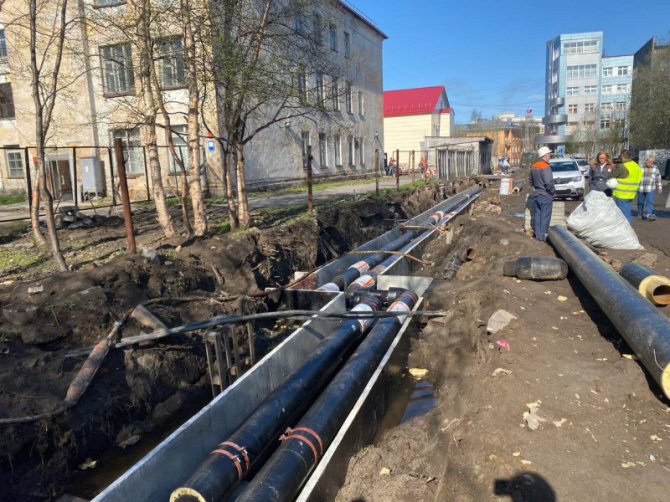 В Мурманске продолжается капитальный ремонт сетей теплоснабжения в Октябрьском округе. В настоящее время проводятся земляные работы, а также начата укладка труб на некоторых участках.