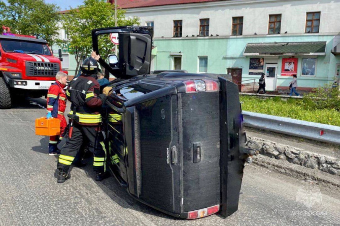 Сегодня утром в Североморске произошло ДТП на перекрестке улиц Северная Застава и Советская. Автомобиль Mazda BT-50 выехал на дорожный бордюр и перевернулся на левый бок.