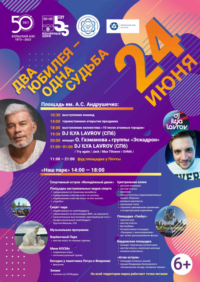 24 июня в Полярных Зорях в честь 50-летия пуска первого энергоблока Кольской АЭС и 55-летия города-спутника для жителей и гостей организуют около 100 праздничных мероприятий – концерты, мастер-классы, соревнования и многое другое.