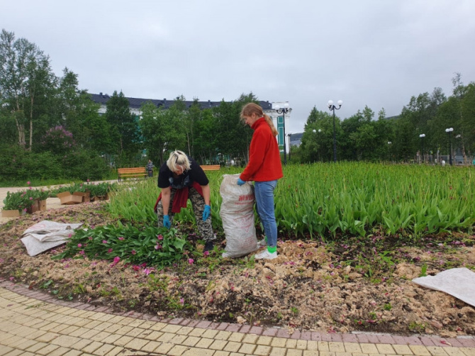 На центральной площади Кировска собирают луковицы тюльпанов. Их период цветения подошел к концу.