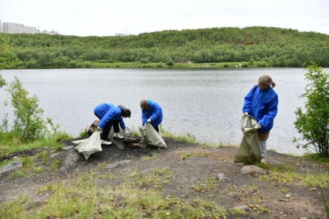 На берегу озера Питьевое в Мурманске отработал экологический десант. Сотрудники и добровольцы Центра развития волонтерского движения в рамках интенсива «Эко-Мурманск» провели уборку территории.