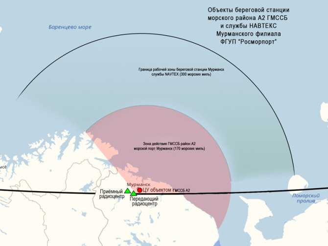 Береговая станция Мурманск морского района А2 ГМССБ включает в себя центр управления связью в Мурманске, а также приемную и передающую станции, которые расположены в Коле. Радиус действия этой береговой станции составляет 170 морских миль.