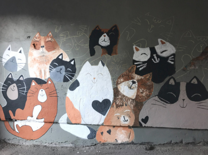 В Мурманске появилась арка, украшенная изображениями кошек. В рамках фестиваля урбан-арта «РОСТ» 6 августа провели мастер-класс по живописи. Мероприятие проходило на улице Беринга, 8.