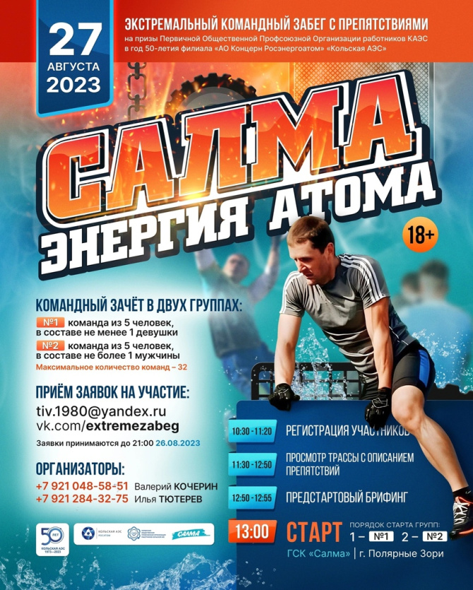 27 августа состоится экстремальный забег «Салма – Энергия атома», посвящённый 50-летию Кольской АЭС. Соревнования пройдут на горнолыжном комплексе Салма – гора Лысая, в 10 км от города Полярные Зори Мурманской области.