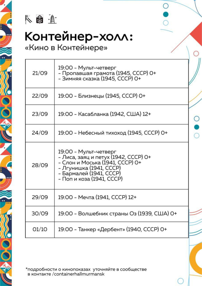 В рамках «Кино в Контейнере» в сентябре пройдут ретро показы советских фильмов. Для юных северян в расписании есть место для мультпоказов.