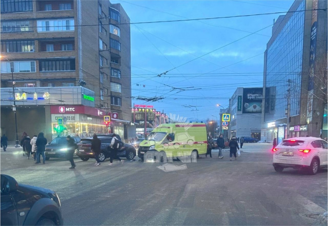 На перекрестке проспекта Ленина и улицы Книповича в Мурманске произошло столкновение автомобиля Kia с машиной скорой помощи около 12:30.