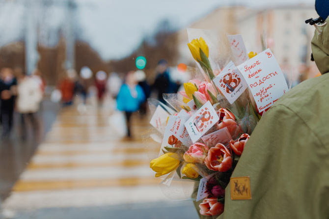 Ведущие Большого Радио раздали на площади Пять Углов более сотни тюльпанов, таким образом радиостанция поздравила мурманчанок с наступающим Международным женским Днем.