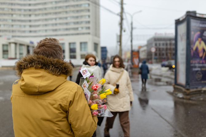 Ведущие Петр Болычев, Дмитрий Рябов, Егор Банишевский и Роман Мурачев раздали более сотни тюльпанов с открытками и поздравлениями менее чем за час.