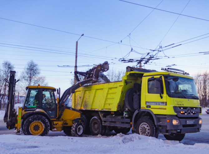 Работы по погрузке и вывозу снега были выполнены ночью на следующих участках: улица Адмирала флота Лобова в районе дома № 9 (заездной карман); тротуары по проспекту Героев—североморцев (в районе парка на Семеновском озере); улица Чумбарова-Лучинского; улица Скальная; проезд Северный в районе домов №№ 13-21.