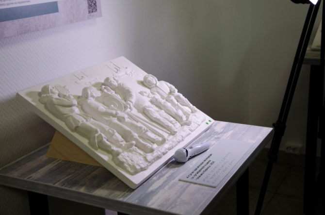 Эта уникальная серия из восьми тактильных барельефов, посвящённых истории Российской Арктики, передана Мурманскому областному художественному музею на 5 лет. Авторами барельефов являются профессиональные скульпторы и лауреаты международных и всероссийских конкурсов Василиса и Наталия Карповы.