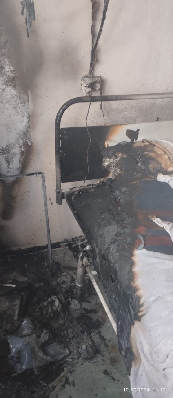 В результате пожара в палате на 3 этаже терапевтического отделения сгорела кровать на площади 3 м², а помещение закоптилось. Пожарные провели дымоудаление.
