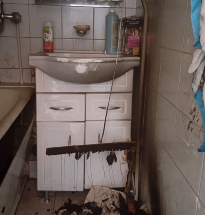 В результате пожара в двухкомнатной квартире в ванной комнате сгорели постельные принадлежности на площади 0,5 м². Для вскрытия двери квартиры использовался шанцевый инструмент.