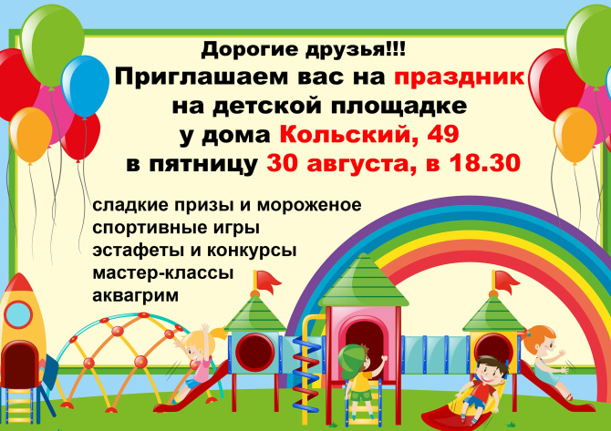 30 августа в 18:30 на детской площадке у дома на проспекте Кольском, 49, начнется детский праздник, организованный Первомайским домом творчества. В программе — спортивные игры, эстафеты и конкурсы, мастер-классы и аквагрим. Партнёр мероприятия, группа компаний «Мурманский Хладокомбинат», подготовил для всех участников сладкие подарки.