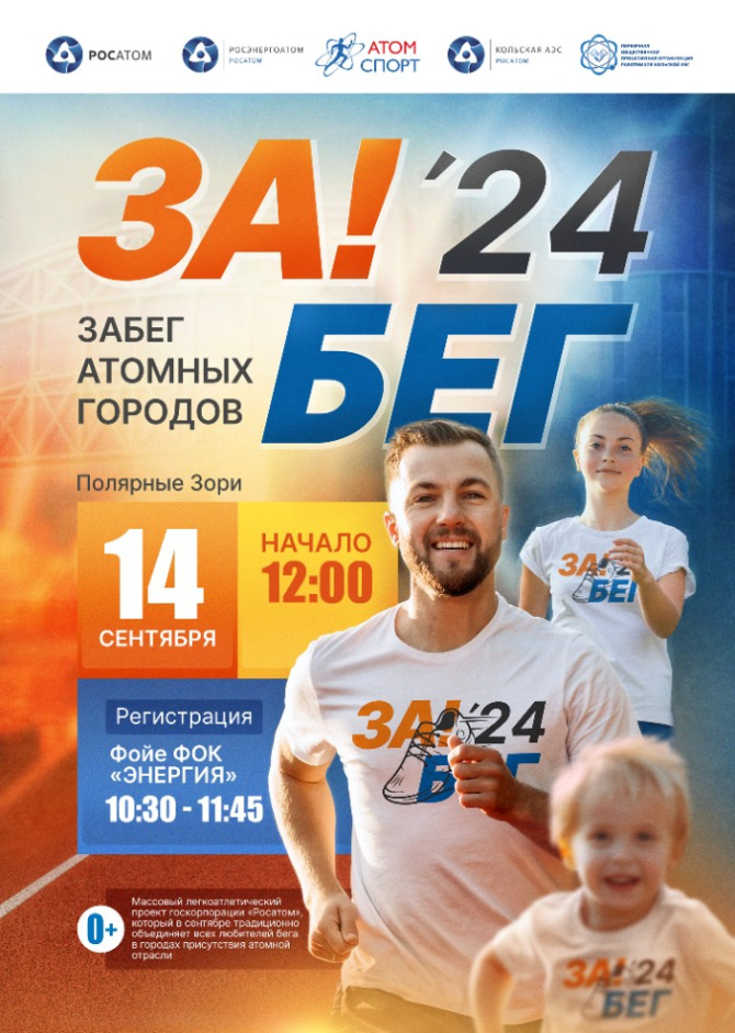 Традиционное ежегодное мероприятие «Забег атомных городов» пройдет 14 сентября 2024 в городе Полярные Зори на территории «Нашего парка». Регистрация участников состоится с 10:30 до 11:45 в фойе здания ФСК «Энергия». Старт мероприятия –