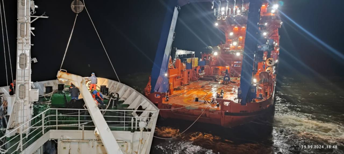 В суровых погодных условиях экипажам обоих судов удалось успешно закрепить буксирный трос. Сейчас караван движется в сторону Мурманска со скоростью 4-5 узлов.