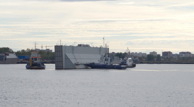Доставку батопорта к месту монтажа в Мурманске организовали строители отдела гражданского судостроения "Звёздочки". Его погрузили на буксиры и отправили с причала предприятия.