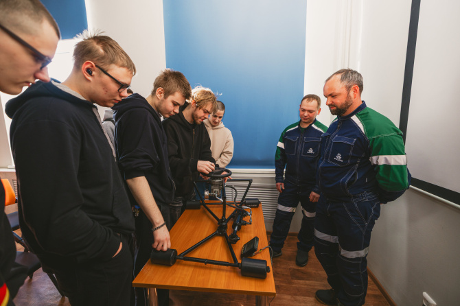 «Мы пытаемся показать нашим слушателям, чем мы занимаемся в работе, какими инструментами пользуемся. Естественно, это всё в миниатюре. На самом деле техника огромная, размером с это помещение, с мощными цилиндрами, насосами высокого давления. Здесь нужно быть аккуратным и постоянно учиться», — рассказал Александр Кочкин, сотрудник цеха сервисного обслуживания Кировского филиала АО «Апатит».