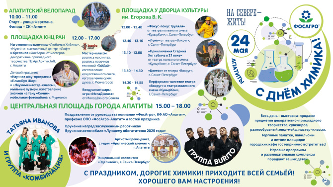 День химика уже давно стал для Апатитов праздником общегородским. Так будет и в этот раз. Основные развлекательные площадки откроются уже в полдень. Как никогда много мастер-классов, рассчитанных на любой вкус, возраст и интересы, пройдет на площадке у КНЦ РАН. Здесь специалисты из Мончегорска научат апатитчан и гостей города окрашивать носки в технике тай-дай и рисовать на деревянных спилах, покажут, как сделать твёрдые духи и искусственный снег. С юными горожанами поделятся своими секретами и сами сотрудники Кольского научного центра.