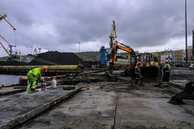 Старое покрытие полностью демонтируют, после чего проведут отсыпку песчаной и щебёночной основы, а затем уложат новые железобетонные плиты. Работы выполняет комплексная бригада №2 второго района порта. В процессе задействованы 3 единицы техники: экскаватор, погрузчик и гидравлический перегружатель.