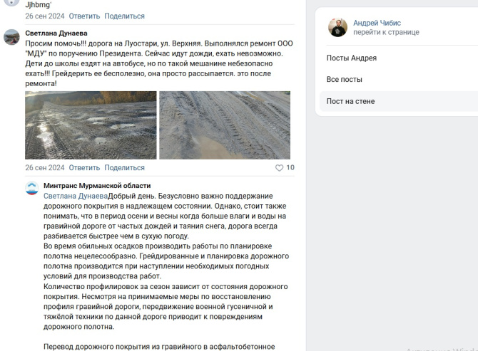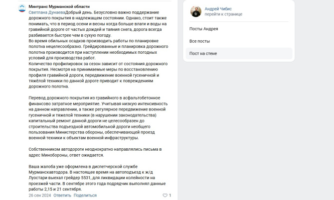 А через несколько дней, 30 октября, обращение заметили и сотрудники «Мурмансавтодора». Они написали, что указанный участок гравийный, а специфика этих дорог такова, что после дождей ее качество ухудшается.