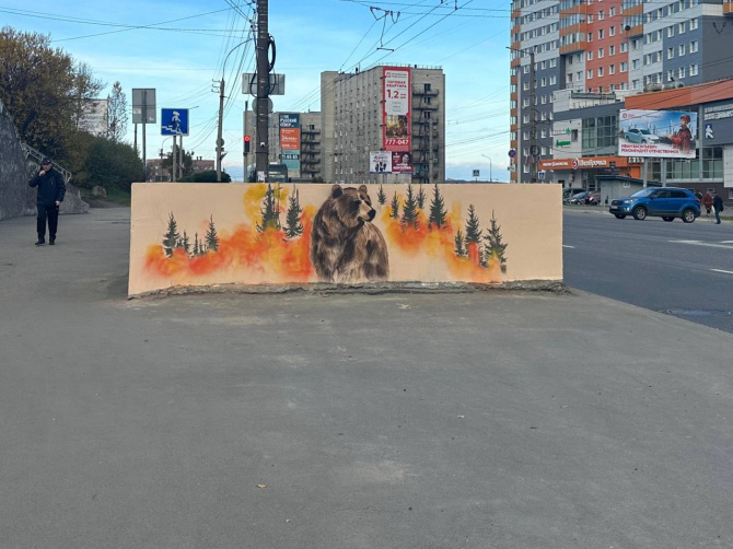 Трудились художники этой ночью. Теперь на входных группах изображены белые и бурый медведи, надпись «Заполярье». Внутри переход тоже приведен в порядок – там покрасили перила.