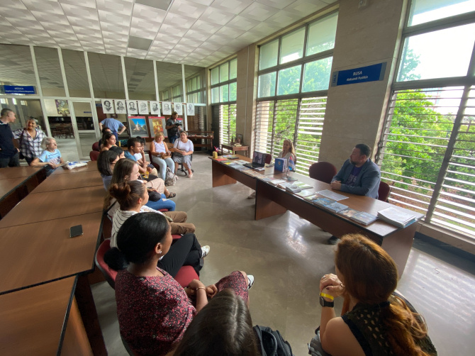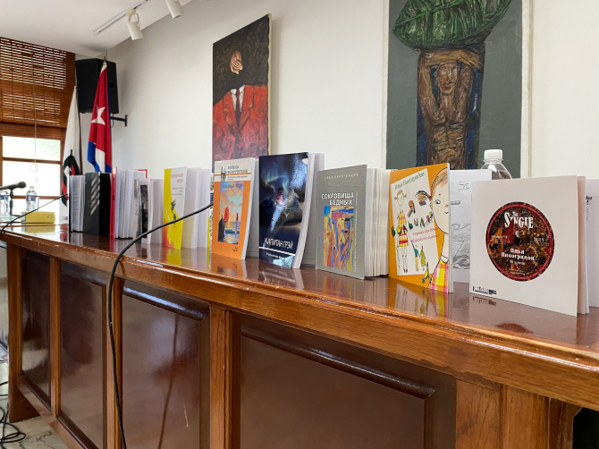 В рамках проекта «Книжная полка русской литературы» российские гости побывали в Кубинском Союзе писателей и художников UNEAC. Председатель Мурманского отделения Союза писателей России Илья Виноградов подарил его президенту Марте Боннет де ла Круз кружку с северным сиянием и антологию современной поэзии России и 14 стран Латинской Америки «Солнечный ветер».