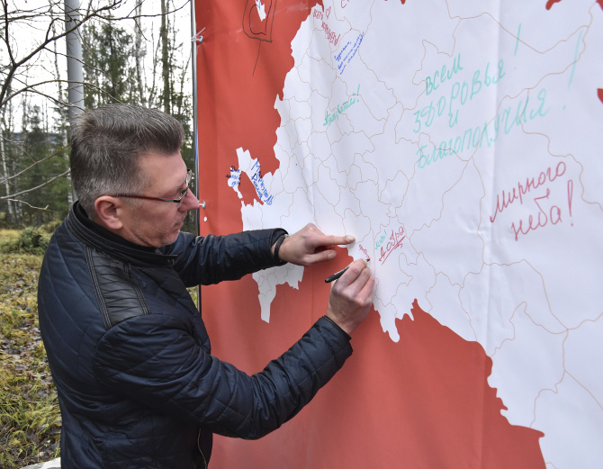 Популярностью пользовался большой трёхметровый куб с тематическими сторонами. На одной гости писали пожелания регионам прямо на карте России, на другой отмечали стикерами родные края. Тут же располагалась фотозона.