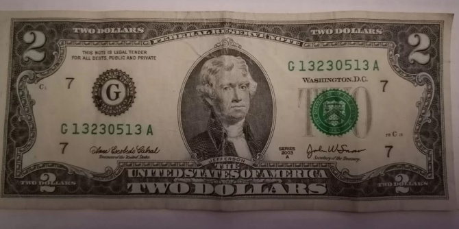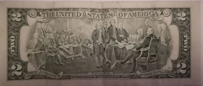 Купюра была перевыпущена в 2003 году в честь двухсотлетия США. На ней изображены Томас Джефферсон и картина Джона Трамбулла «Декларация независимости».